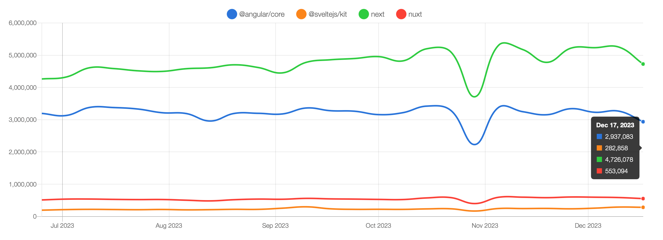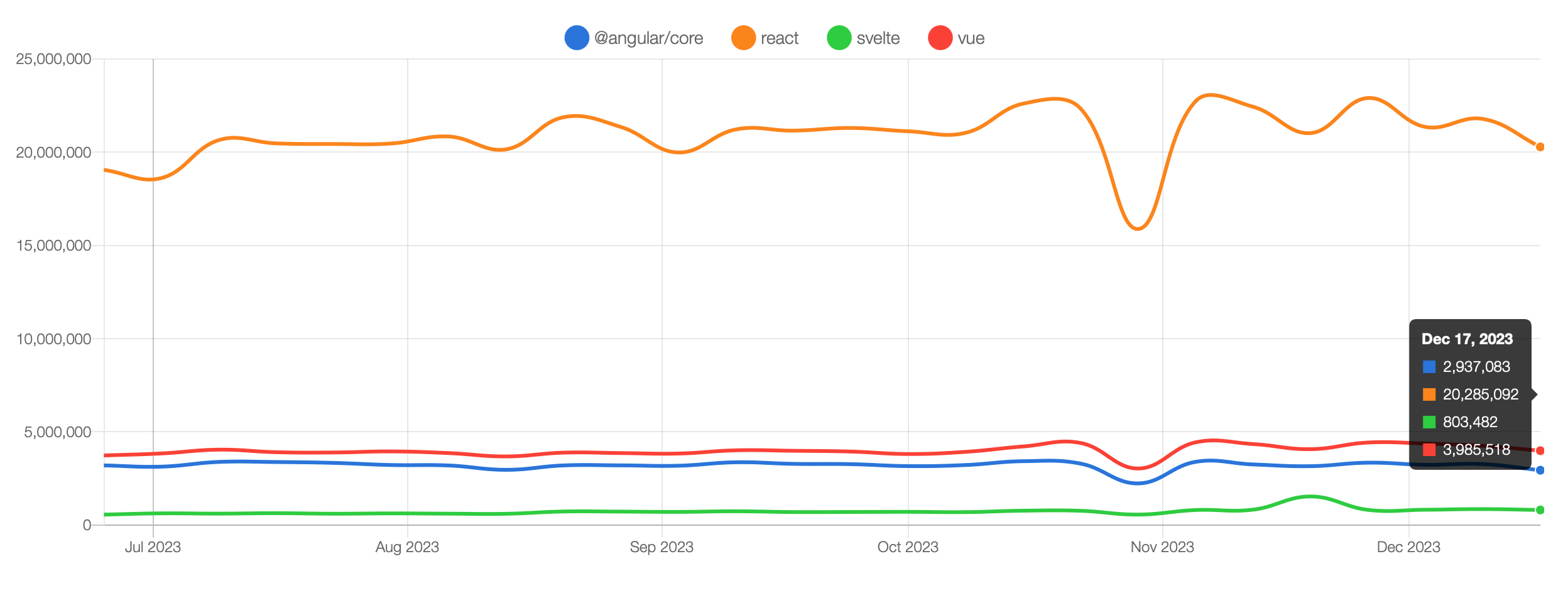 npm trends を見るとやはり React が圧倒的です。来年の今頃はもうちょっと人気出ているといいなあ